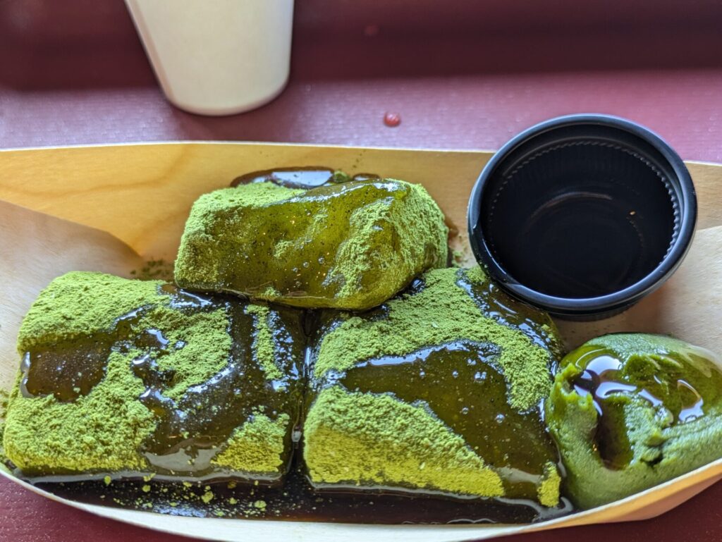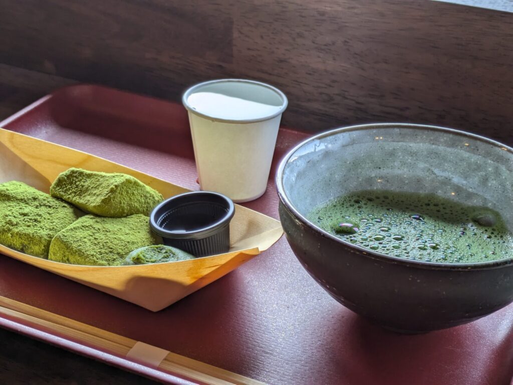 けっこう大きなわらび餅で、黒蜜と抹茶餡がとても甘くて、もちもちぷにゅぷにゅで大満足でした。ドリンクをお抹茶にして正解。苦味が合いましたね。セットで1,000円でした。